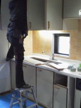 Before リフォーム前![]() 工事前のキッチンいよいよ 解体スタート。 吊戸棚の奥にマンション特有の大きな梁があり、吊り戸棚も低いのを覚えていてくださいね。 |