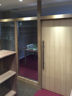 ![]() タモ材の無垢の柱を使い作ったガラス張りの パーテーションで開放的なオフィスになりま した。引き戸もタモ材ツキ板の引き戸をニス 仕上でナチュラルテイストに仕上がりました。 |
