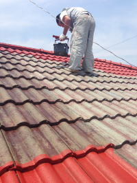 ![]() ⑤ 洗浄後乾いてきたら洋瓦用スラリーシーラーを塗っていきます。 |